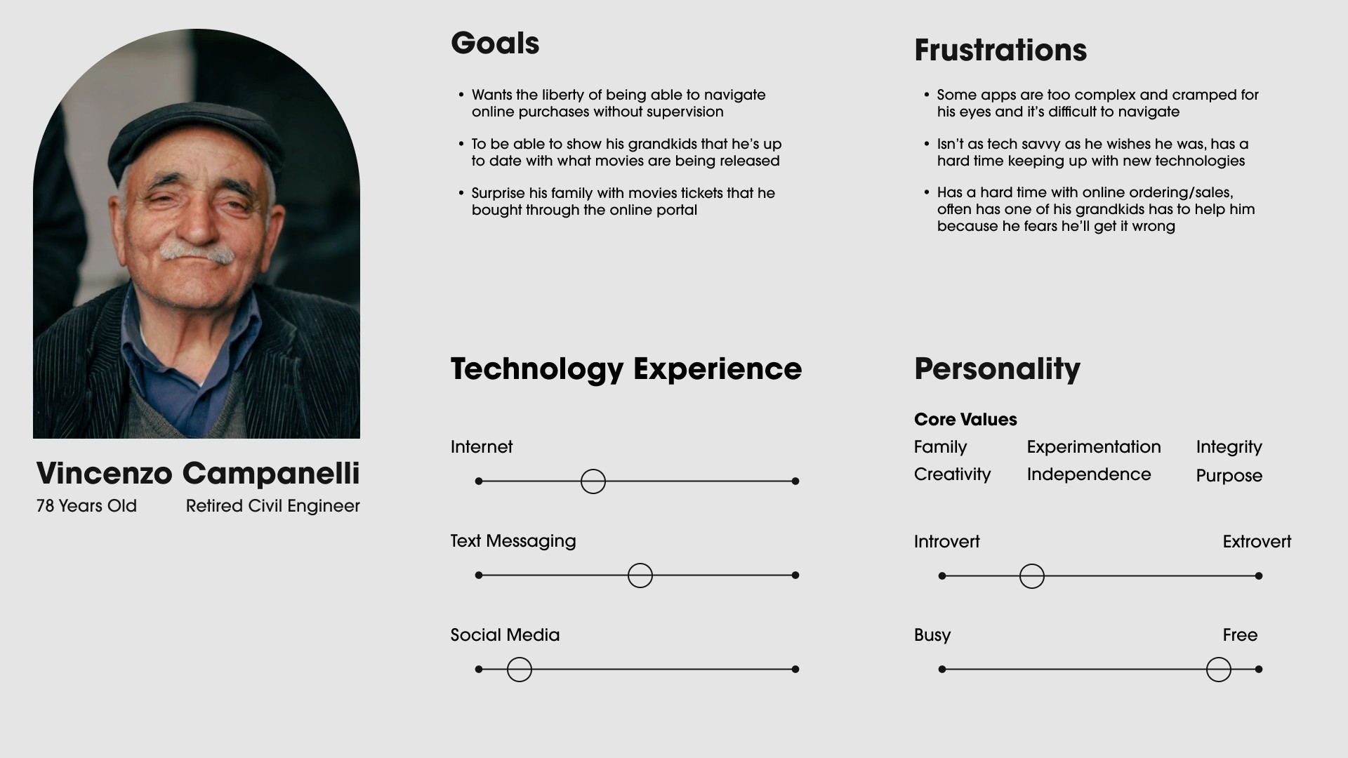 Movie theaters have been a common place of entertainment for generations but certain parts of the process have gotten more complicated over the years. This redesign was a way to help show what a reworking of an online ordering app would look like and how it would open a new set of possibilities for the older generation to experience.