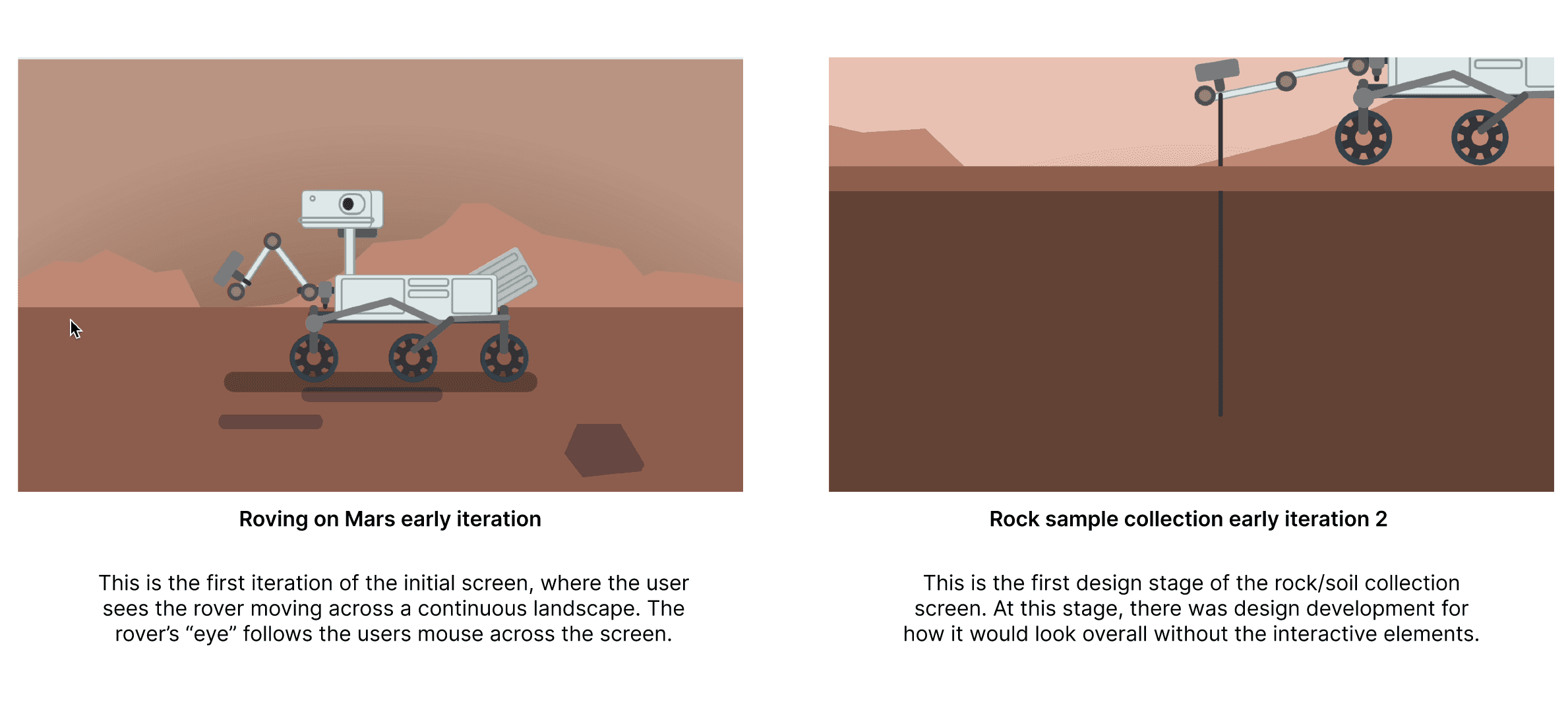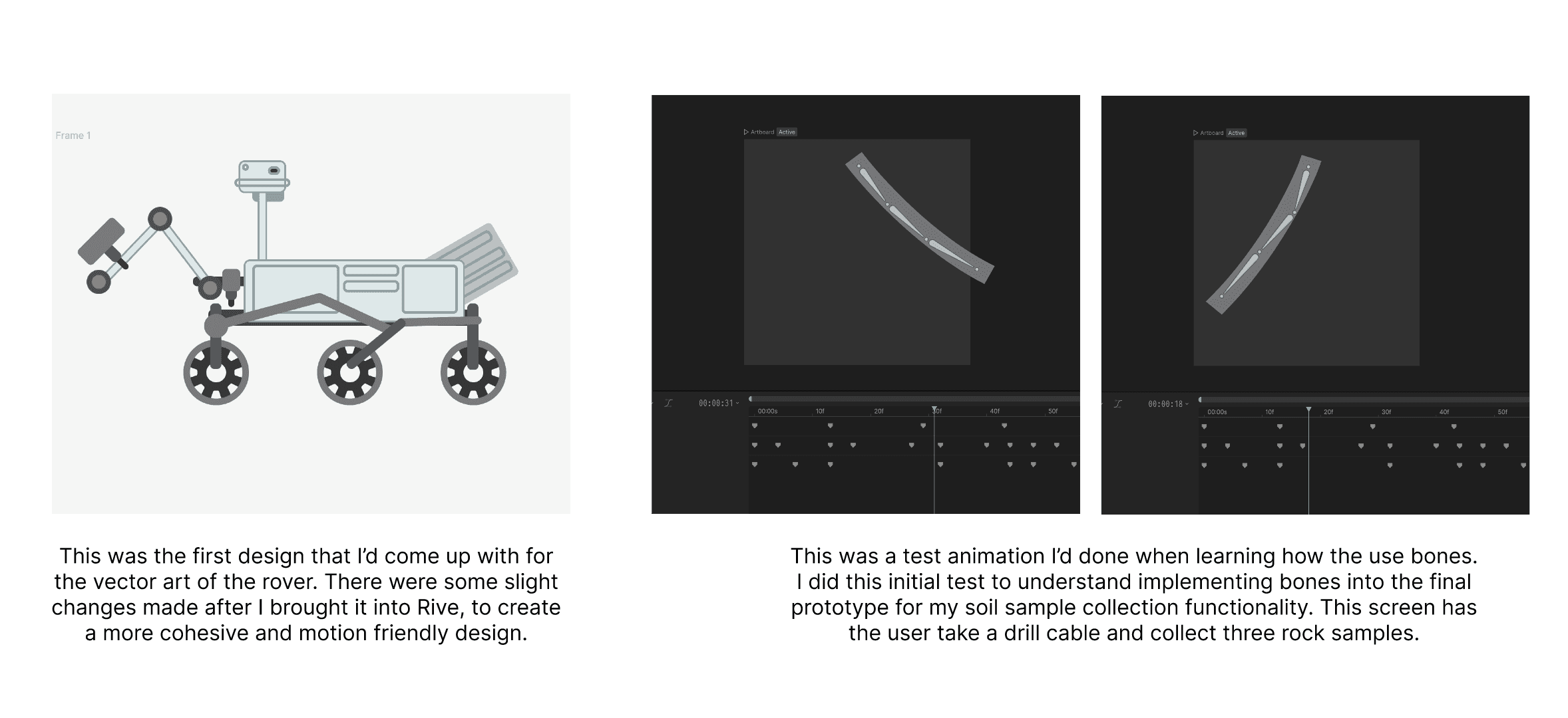 Nailing down interactions and working out the function of the tools available in Rive was crucial in the beginning. These interactions sprouted from extensive research done about the Mars Rover and it's functions