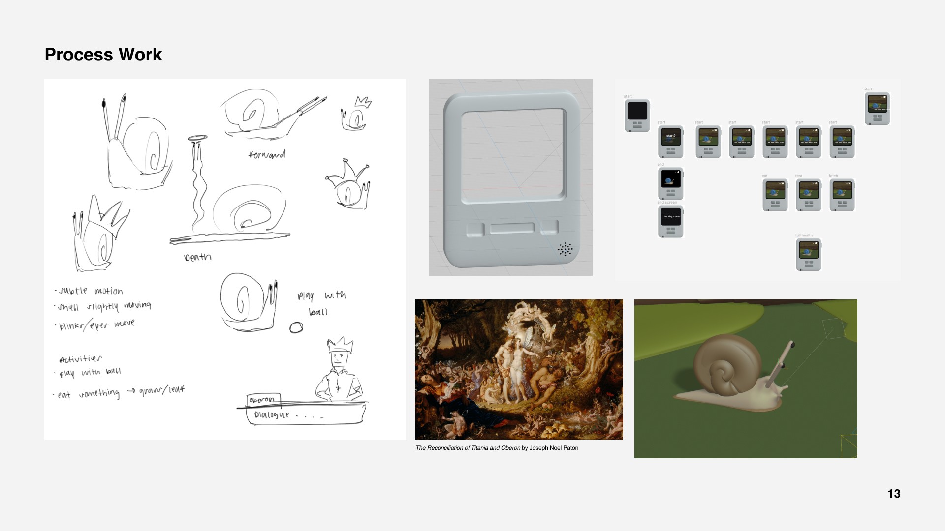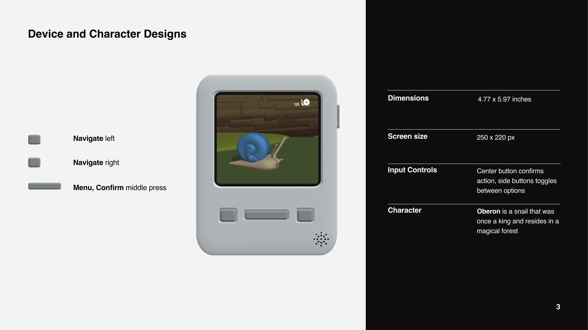 I started with a bit of research for my character and development of the device that is to be used. Leaning into how silly I could make things, I chose to make the digital pet a snail but I had the freedom to make the backstory as interesting and ridiculous as I could. The freedom also applied to what the Tamagotchi was capable of and how the user would operate it.