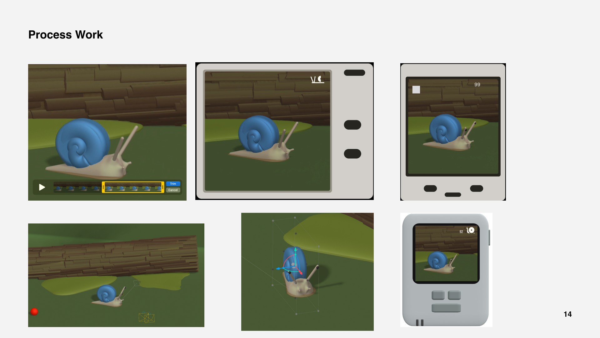 Modeling the tamagotchi character, the snail, and working out all the animations was honestly the part that took the longest overall.